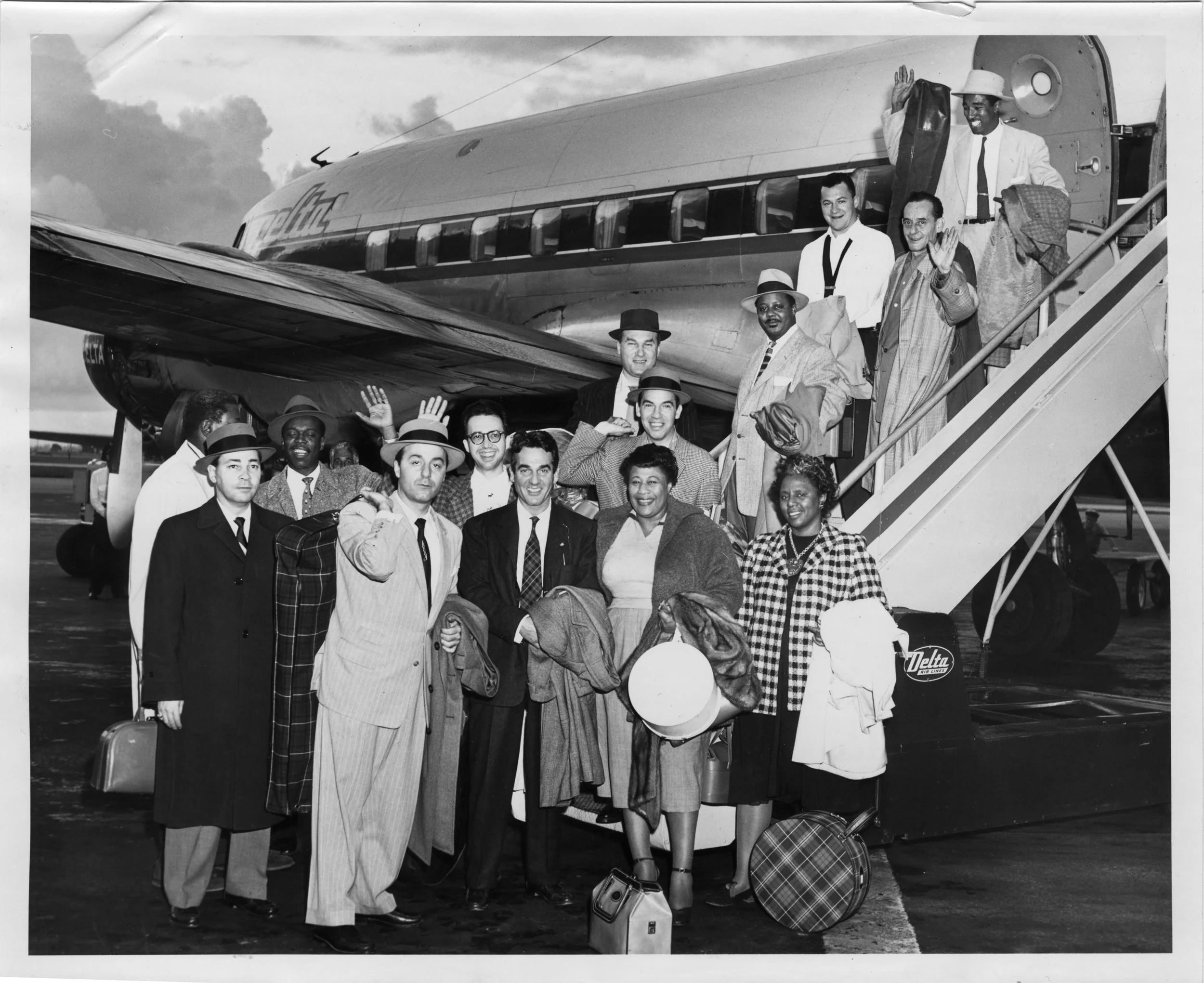 Norman Granz’s Jazz at the Philaharmonic group arrive in Miami from Chicago by Delta Airlines for their Wednesday night engagement at the Miami Beach Auditorium. In the group are Oscar Peterson, Gene Krupa, Buddy Rich, Barney Kessel, Ella Fitzgerald, Norman Granz, Flip Phillips, Charlie Shavers, Ray Brown, Willie Smith and Lew Gilbert, Manager.